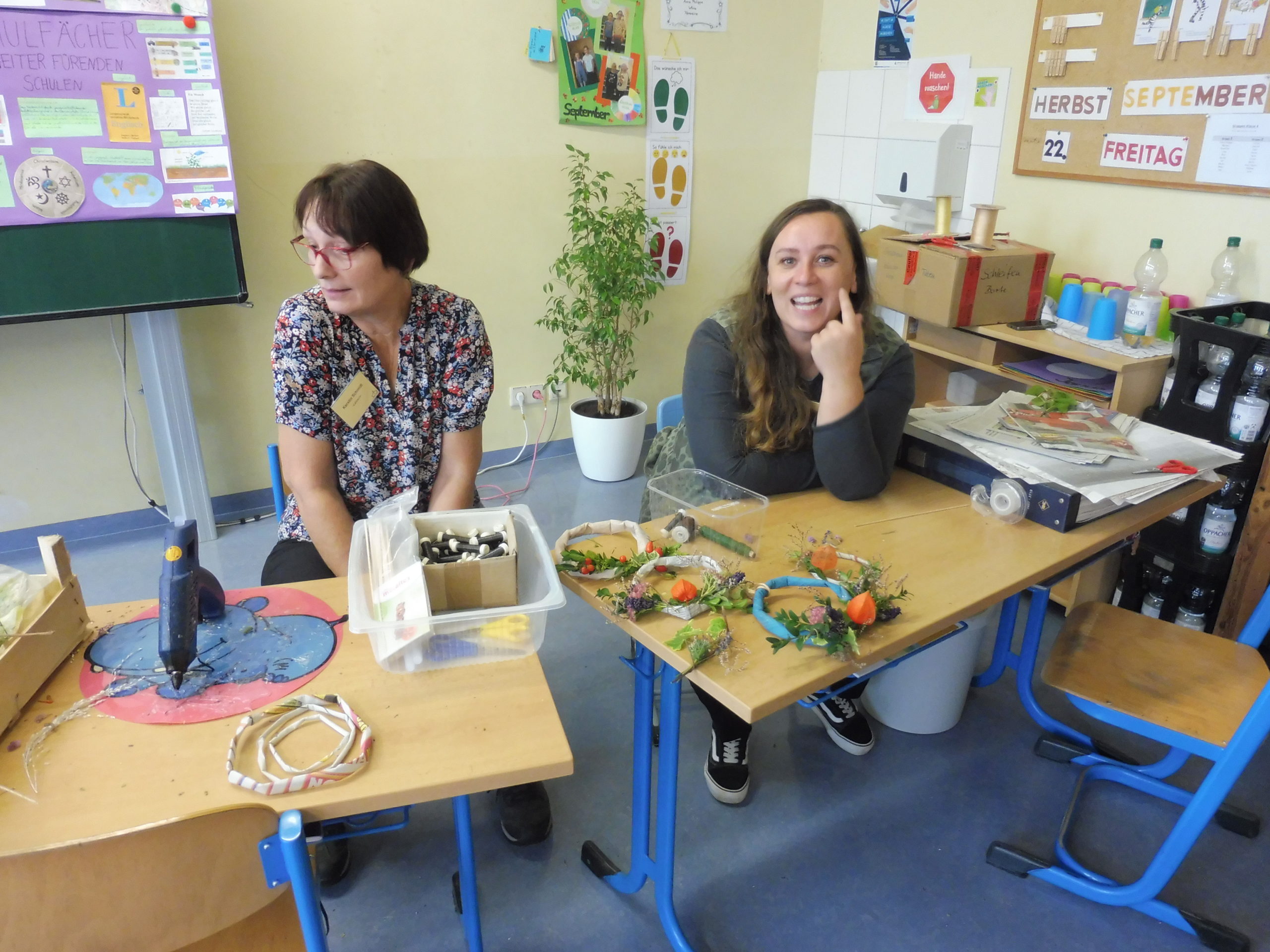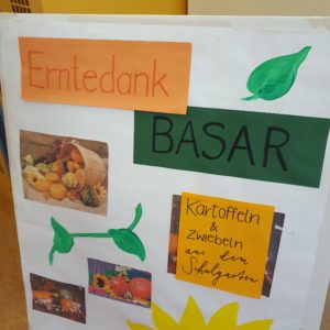 Auch in diesem Jahr war unser Erntebasar wieder reichlich aufgestellt. So konnten wir viele Produkte aus dem Schulgarten (wie Kartoffeln und Zwiebeln), aber auch selbst Hergestelltes (wie Kerzenständer, Anhänger, Weihnachtsdeko) anbieten. Sehr gern wurde unser selbst hergestellter Kräuteressig und das frisch gebackene Brot erworben.